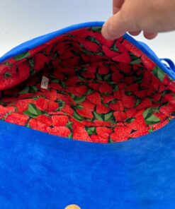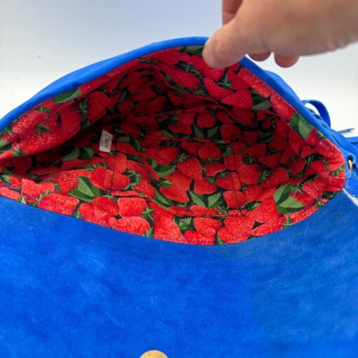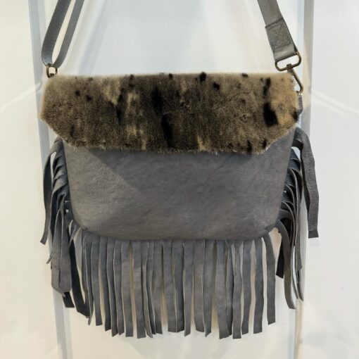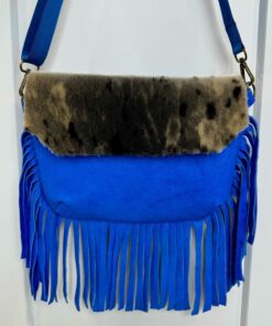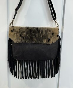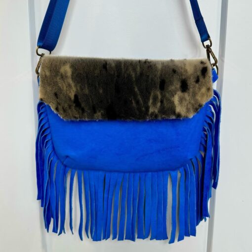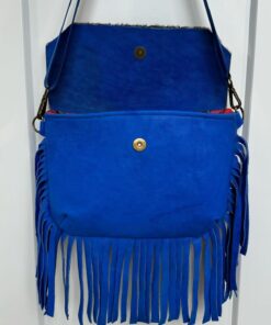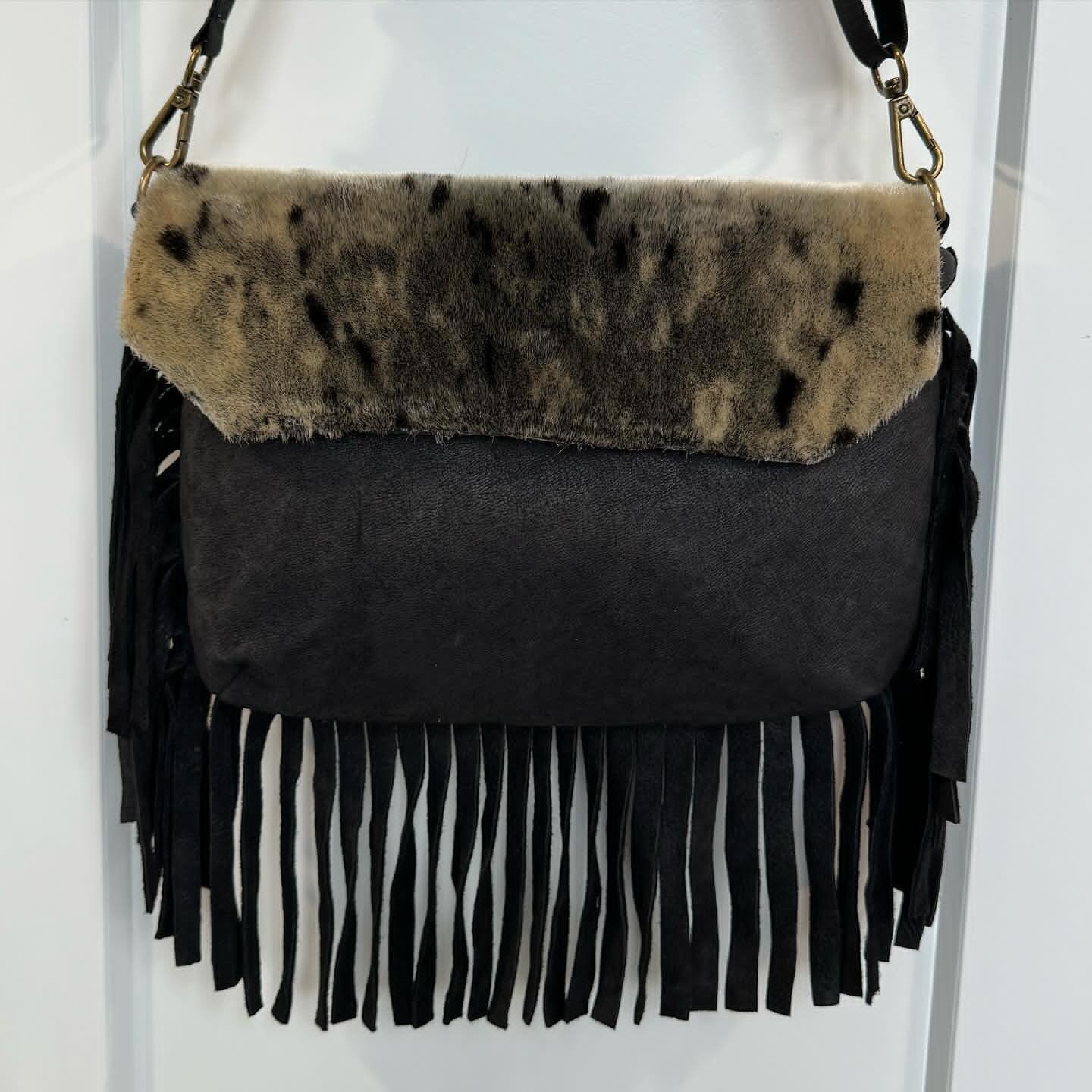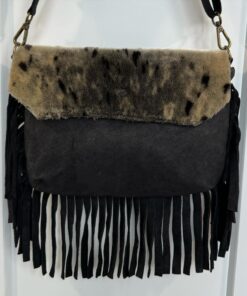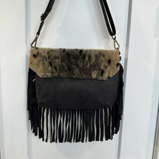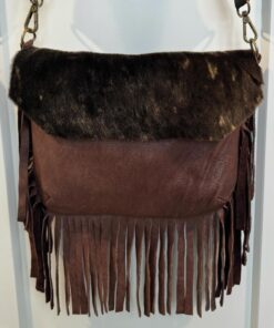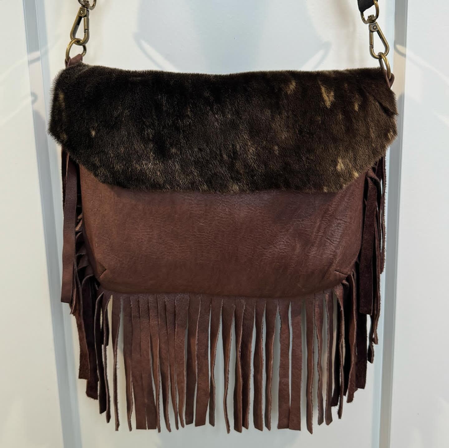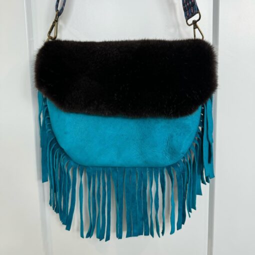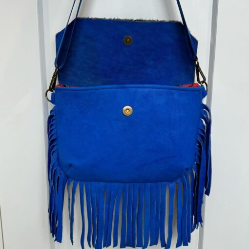 Bag portion (excluding fringe) Measures approximately 11.5” wide x 9” tall x 2.5” deep. It features an adjustable, removable nylon strap